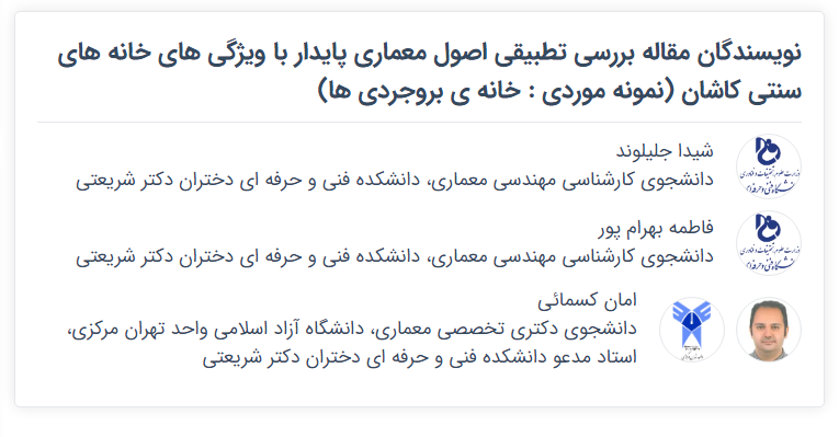 به گزارش معاونت پژوهش و فناوری، خانمها شیدا جلیلوند و فاطمه بهرامپور از دانشجویان رشته معماری به راهنمایی آقای امان کسمایی مدرس گروه معماری و ساختمان، موفق به ارائه مقاله با مشخصات زیر، شده اند:
