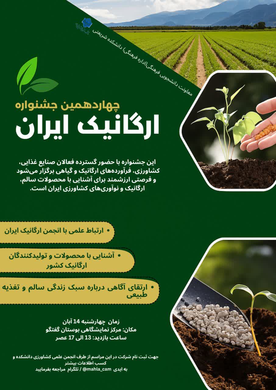 این جشنواره با حضور گسترده فعالان صنایع غذایی، کشاورزی، فرآوردههای ارگانیک و گیاهی برگزار میشود و فرصتی ارزشمند برای آشنایی با محصولات سالم، ارگانیک و نوآوریهای کشاورزی ایران است.