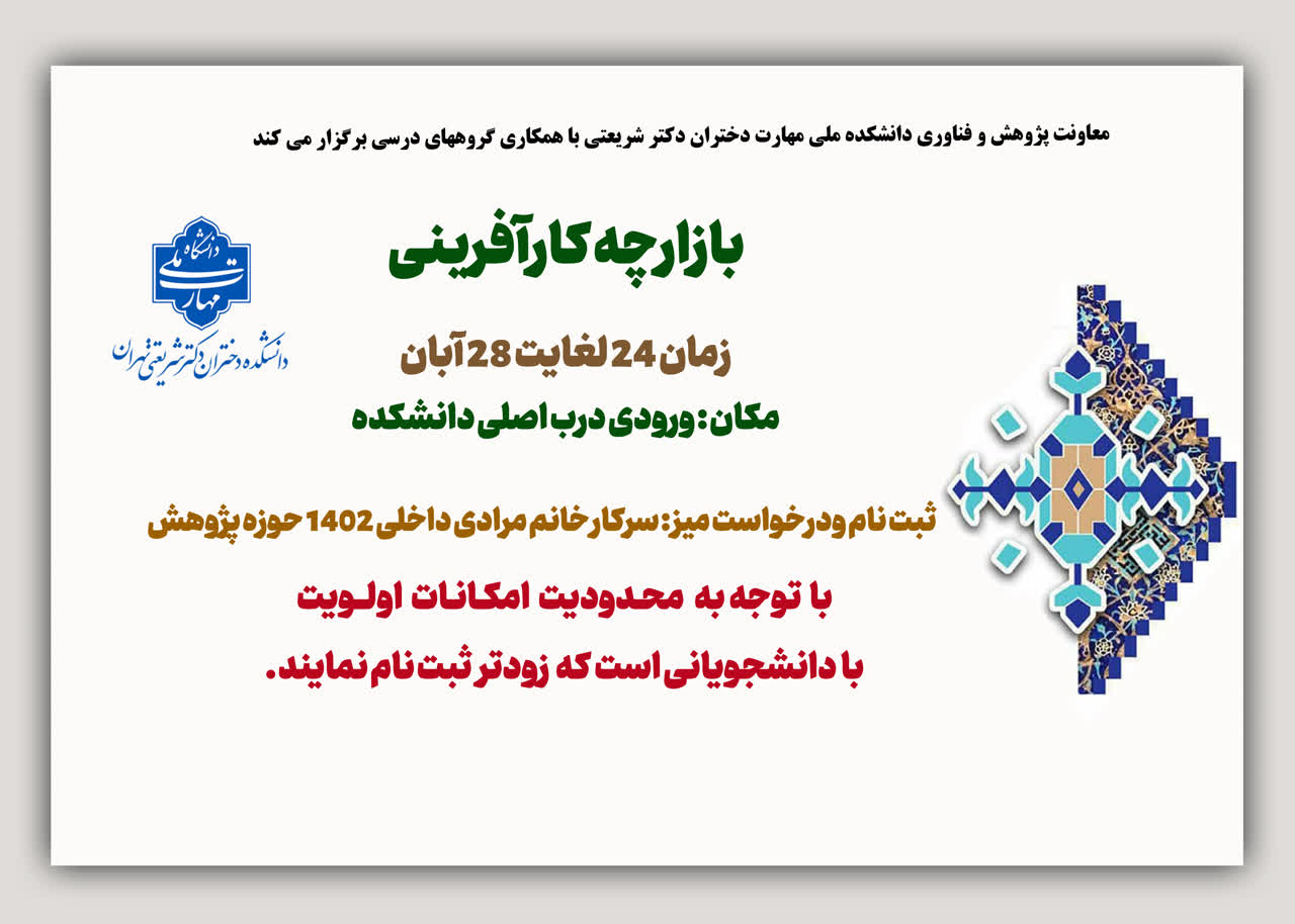 بازارچه کارآفرینی ۱۲ آبان ۱۴۰۴ | ۱۴:۱۴ کد : ۹۴۷۵ اطلاعیه ارسال به دیگران نام شما ایمیل شما ایمیل دریافتکننده ارسال انصراف تعداد بازدید:۳۱ معاونت پژوهش و فناوری به مناسبت هفته کارآفرینی برگزار می کند: