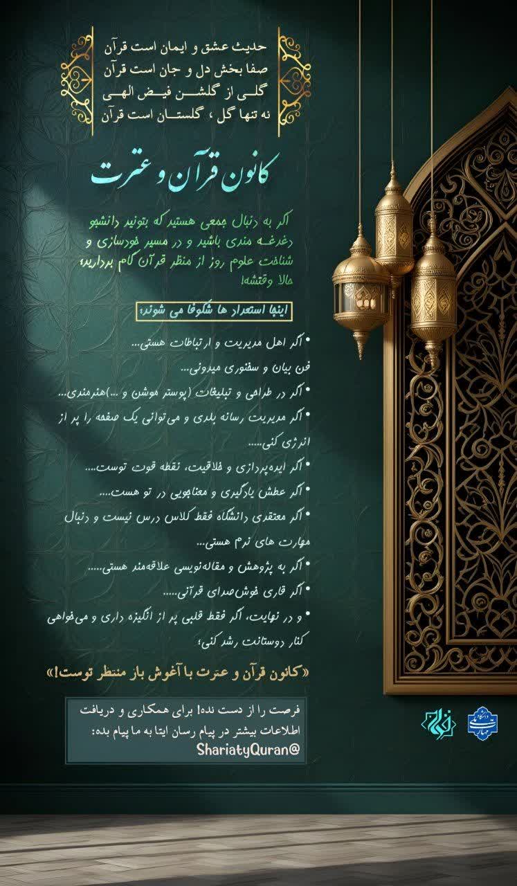 جهت عضویت و اطلاع از برنامهها، به ایدی @ShariatyQuran پیام دهید.