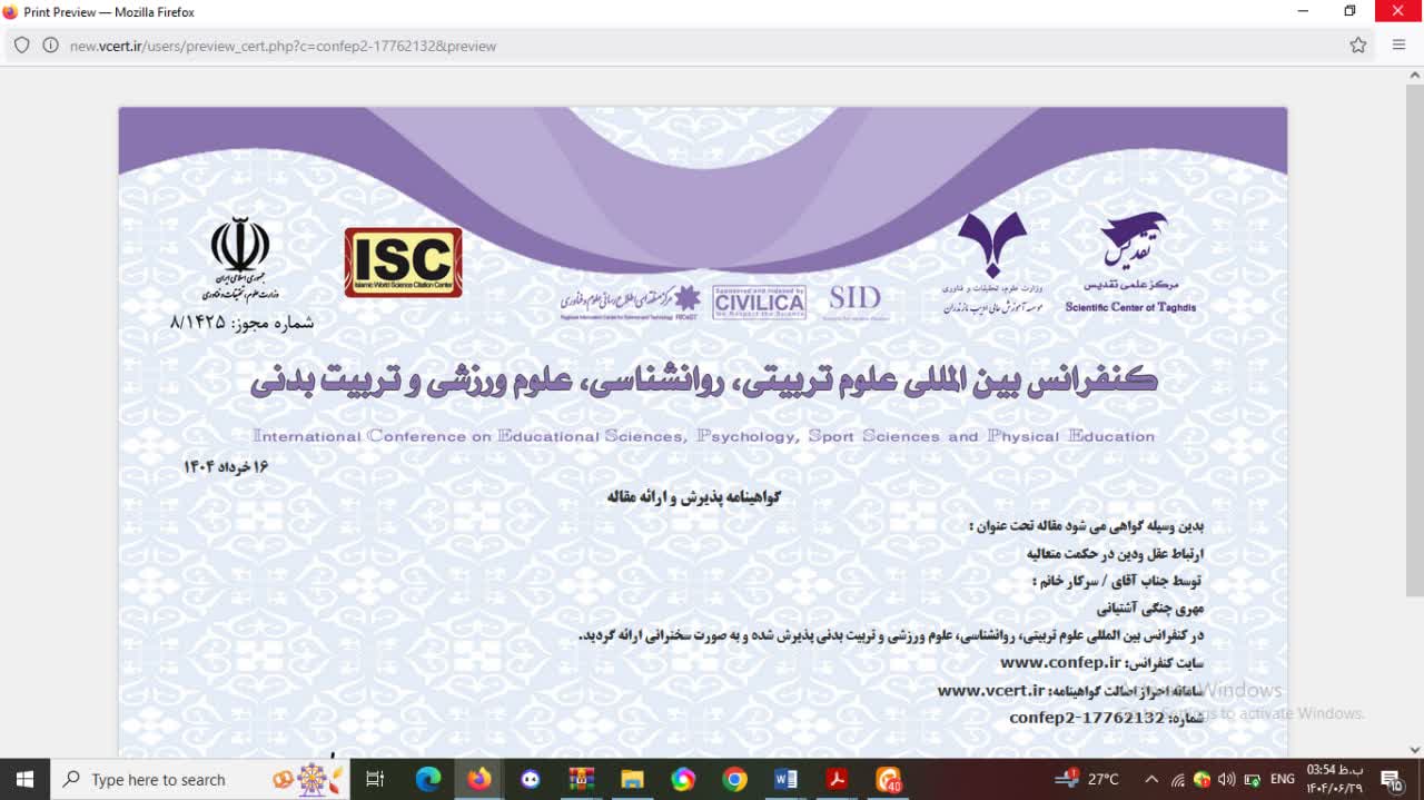- ارتباط عقل ودین در حکمت متعالیه ، کنفرانس بین المللی علوم تربیتی، روانشناسی، علوم ورزشی و تربیت بدنی