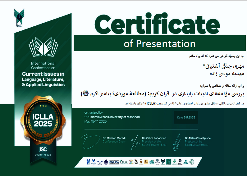 - بررسی مؤلفه های ادبیات پایداری در قرآن کریم: (مطالعۀ موردی؛ پیامبر اکرم صلى الله علیه وسلم) ، همایش بین المللی مسائل جاری در زبان، ادبیات و زبانشناسی کاربردی